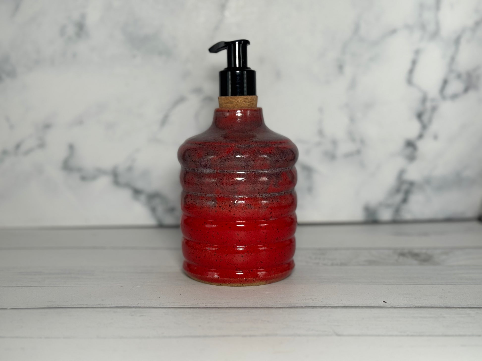 This hand-thrown soap and lotion dispenser is perfect for your sink area. Each bottle is carefully shaped by hand, with decals applied to the clay and hand-painted using underglaze. The dispenser comes complete with a pump spout for easy use, ~14oz
